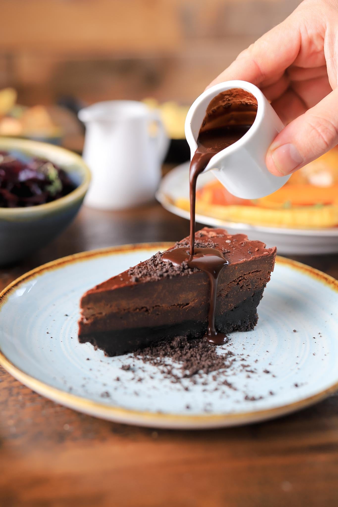 Our ultimate hamper contains everything you need for your Christmas day feast; a vegan turkey joint, pigs in blankets & four slices of chocolate cherry Mississippi mud pie for pudding.