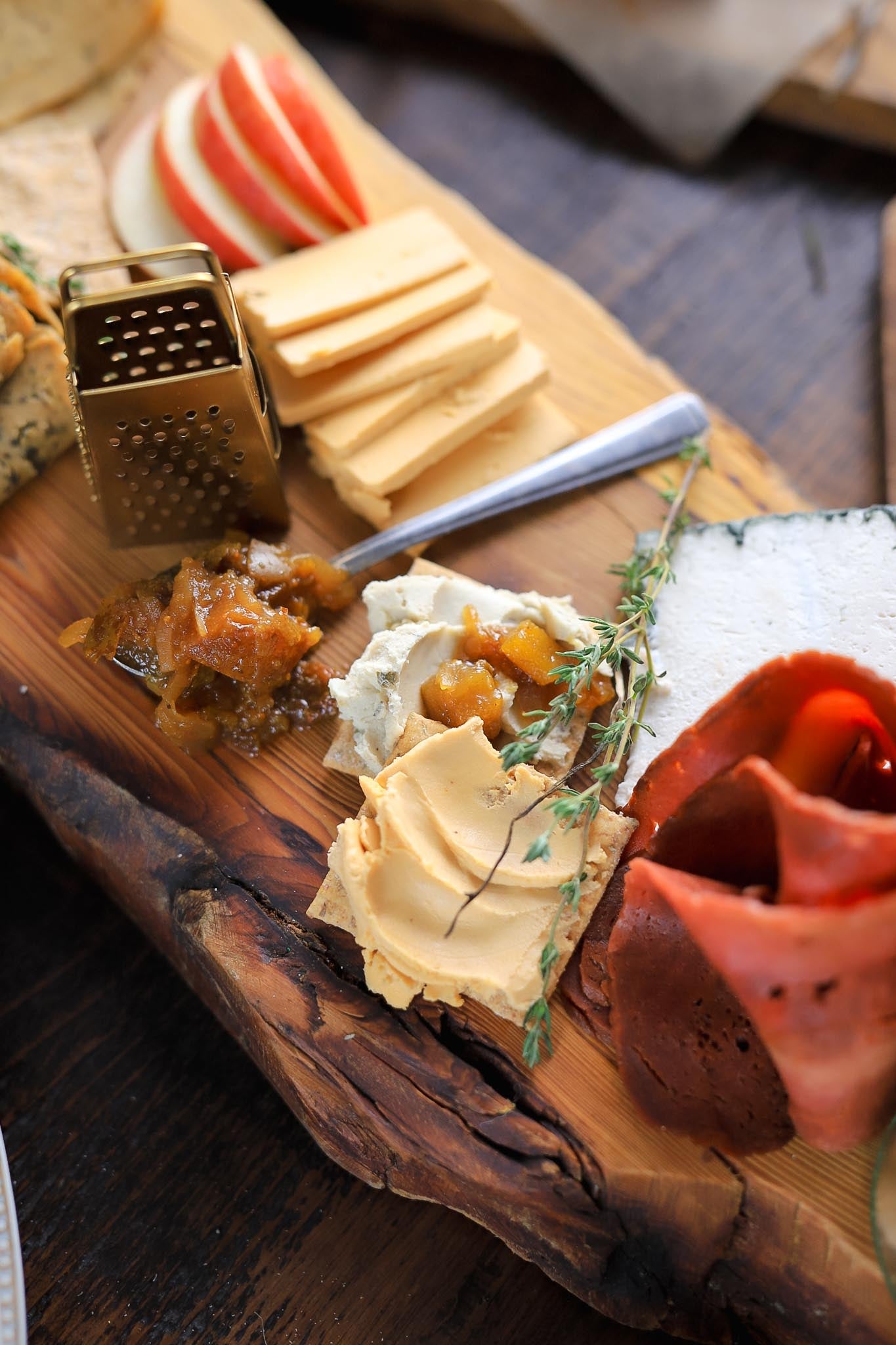Four Faux deli meats, pastrami, salami, kebab & turkey, Honestly Tasty blue cheese & shamembert, two Kinda Co cheeses, crackers & chutney